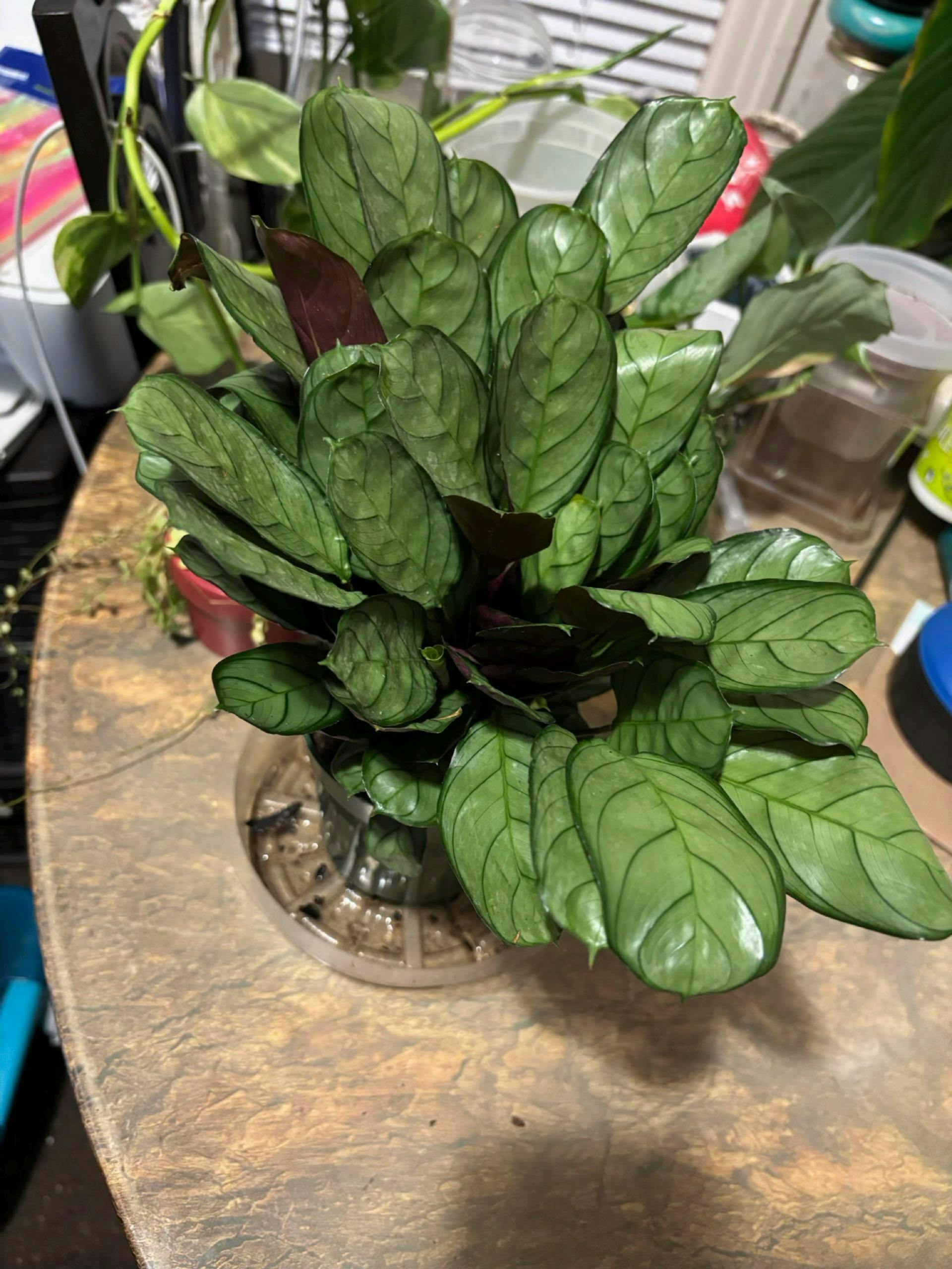 Ctenanthe burle-marxii ‚ÄòAmagris‚Äô üåø‚ú® is a slow-growing tropical houseplant known for its pale grey-green oval leaves adorned with dramatic dark green stripes. Its deep purple stems and undersides add stunning contrast. Like other prayer plants, its leaves fold up at night, making it a charming addition to any indoor jungle.